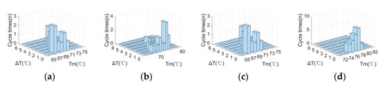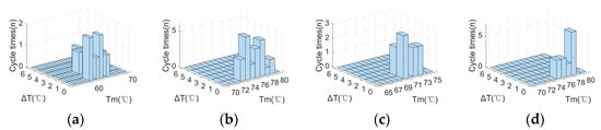 The rainflow counting results depicted in Figure 18a,b correspond to the junction temperature before and after reactive power injection as shown in Figure 17b. In Figure 18a, the distribution of Tj_mean for cycles ranges from 67 °C to 72 °C, encompassing a total of 13 cycles, and the ΔT of cycles ranges from 0 °C to 4 °C. Similarly, in Figure 18b, the Tj_mean of cycles is distributed between 69 °C and 77 °C, with a total of 15 cycles, and the ΔT of most cycles are below 2 °C. Furthermore, Figure 18c illustrates the rainflow counting result of the red curve in Figure 17d, where the Tj_mean of 13 cycles is distributed between 67 °C and 72 °C, and the ΔT ranges from 0 °C to 4 °C. In contrast, Figure 18d showcases the rainflow counting result of the blue curve in Figure 17d, where the distribution of Tj_mean for 24 cycles ranges from 75 °C to 80 °C, with the majority representing minor cycles characterized by ΔT values below 1 °C. As a result of the reactive power injection algorithm, the number of minor cycles increases. This indicates that the algorithm effectively reduces the amplitude of the junction temperature cycle and leads to a higher occurrence of minor cycles. By reducing the cycle amplitude, the algorithm helps mitigate the thermal stress on the power devices, which contributes to improving the reliability and lifetime of the power devices.