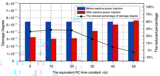 By substituting the relevant data into the Lesit model and applying Miner’s rule, the accumulated fatigue damage for Figure 18a, Figure 18b, Figure 18c, and Figure 18d is calculated as 5.4057 × 10−11, 3.3294 × 10−11, 5.4057 × 10−11, and 5.0462 × 10−11, respectively. Thus, considering the parameter settings delineated in this scenario when the equivalent RC time constant is defined as 5 and 40, the algorithm effectively prolongs the lifetime of the IGBT module by 38.41% and 6.65%, respectively. Another four sets of contrast items were added to the original ones by changing the equivalent RC parameters. As indicated in Table 4, when the equivalent RC time constant is set to 15 s, 20 s, 30 s, and 50 s, the algorithm demonstrates the ability to extend the lifetime of the IGBT module by 43.03%%, 41.97%, 21.50%, and -3.88%, respectively.