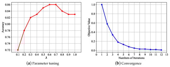 In our proposed approach, is an essential parameter to control the strength of utilizing original high-dimensional data information. Moreover, since GoMPL employs the iterative scheme to solve the optimization problem, we also need to test the convergence rate of our approach. Therefore, to show the impact of the regularization parameter and analyze the convergence, we conduct another experiment on the ORL dataset to demonstrate the performance of GoMPL. Figure 2a shows the accuracies of GoMPL with different values of . From Figure 2a, we can find that the value of exercises considerable influence on the performance of GoMPL. Moreover, GoMPL can obtain the best performance when on the COIL-20 dataset. From Figure 2b, we can see that the proposed GoMPL converges in less than 10 iterations.