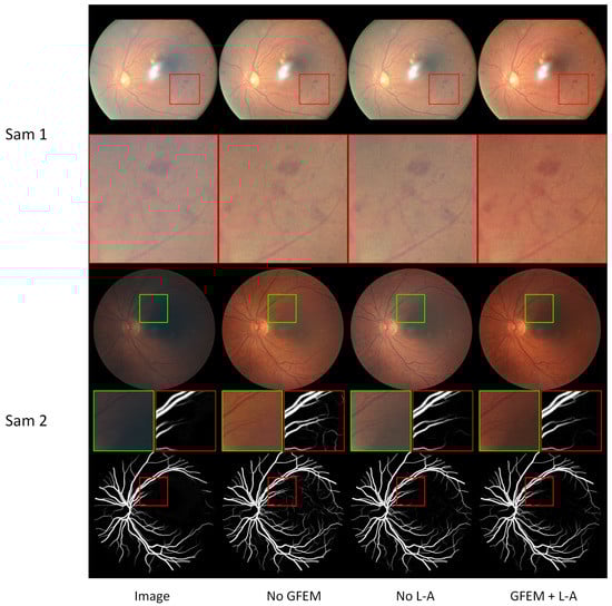 For the ablation experiments, we train models with different modules on EyeQ. A high SSIM score indicates a more detailed image. As shown in Table 1, the GFEM + L-attention module achieves a PSNR value of 24.32, representing an improvement of 0.85 over the No GFEM module and 0.74 over the No L-attention module. Furthermore, the GFEM + L-attention module exhibits an SSIM value of 0.8932, which is 0.0062 higher than the No GFEM module and 0.0003 higher than the No L-attention module. Although the margin with the No L-attention module is minimal, it nonetheless underscores the superior performance of the GFEM + L-attention module in retaining structural similarity of the image. Figure 2 shows the impact of the different components on the model. In Sam 1, the absence of luminance attention causes the image to be partially over-lit. Sam 2 shows the impact of GFEM. When there is no GFEM, noise in the dark areas is incorrectly identified and enhanced, resulting in false features. It results in the appearance of details of blood vessels that are not present in the original image.