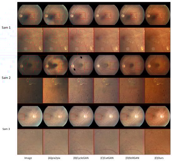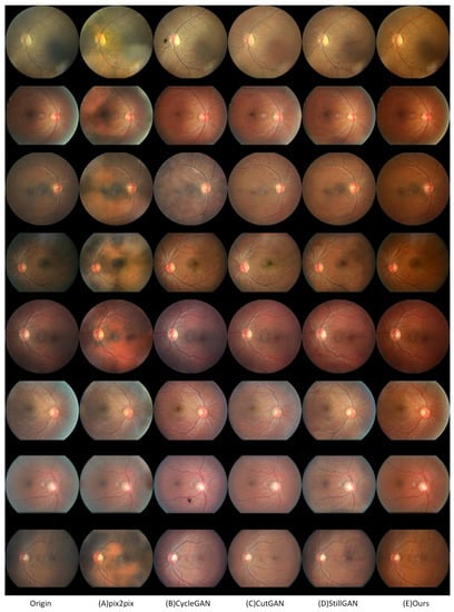 We compare with other GAN-based image enhancement methods, and the comparison results are shown in Figure 3. The first column is the original color fundus image. The second column is pix2pix [39] trained on the dataset based on the synthetic high- and low-quality images. The third to fifth columns are CycleGAN, CutGAN [40], and StillGAN, trained on the dataset using real unpaired high- and low-quality color fundus images. The last column shows the results produced by our method.