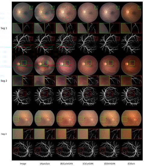 Color fundus images are diagnosed based on anatomical and pathological features in the images. Therefore, fundus image enhancement needs to maintain image viewing, structural features, and pathological features. To verify the retention of structural features after enhancement, we use Iter-Net [41] as the retinal vessel segmentation method. We segment the retinal vascular structure after enhancement by different methods. The degree of visibility and continuity of blood vessels in the segmentation results are analyzed to determine the effect of image enhancement. The comparison results are shown in Figure 4. The enhanced fundus image from our method can segment more vascular detail than the original image. CycleGAN and CutGAN have poorer vascular continuity and show vascular details that were not present in the original image. In the dark areas of the image, the low contrast of the background color of the blood vessels results in poor image visibility. The application of our method manifests a notable enhancement in the depiction of vascular details. However, the vascular structures enhanced by Pix2pix, CycleGAN, and CutGAN appear relatively disordered, while StillGAN and our proposed method demonstrate superior performance in terms of vascular detail and continuity.