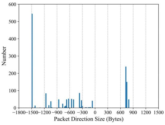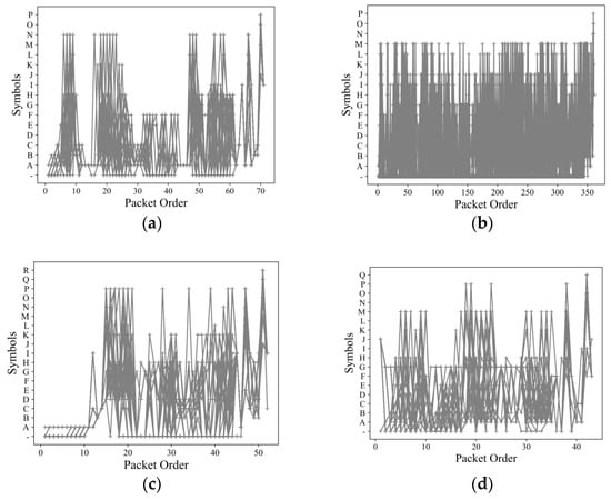 Packet time information is easily affected by network conditions; thus, it is not as stable as packet length. In this paper, like previous works [6,12,13], we utilize the packet length and direction to represent a packet, i.e., a traffic sequence S = (p1, p2, … pn), where pi = ±li, li is the length of the ith packet, and the sign indicates its direction. The traffic sequences are symbolized and aligned to construct the associated action patterns. We describe the traffic sequence symbolization and alignment in the following part.