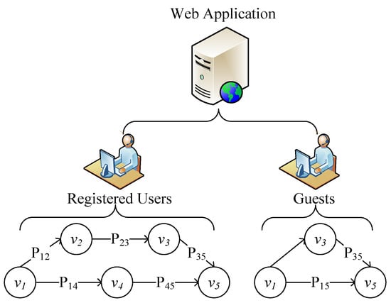 Figure 2 is an example of a web application with two user roles, i.e., Registered Users and Guests. As depicted in this figure, vi denotes a user action, and Pij represents the transition probability between vi and vj.