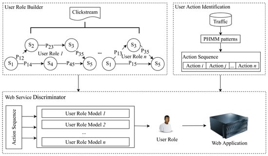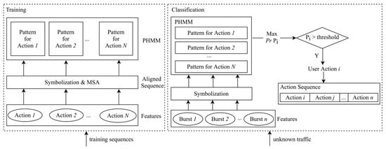 According to the previous study, the network traffic sequence of a given user action typically follows a pattern that depends on the nature of the user–service interaction of that action. These patterns can be used to recognize a specific user’s actions from online network traffic. In this part, we use a machine learning method PHMM to model different users’ actions.