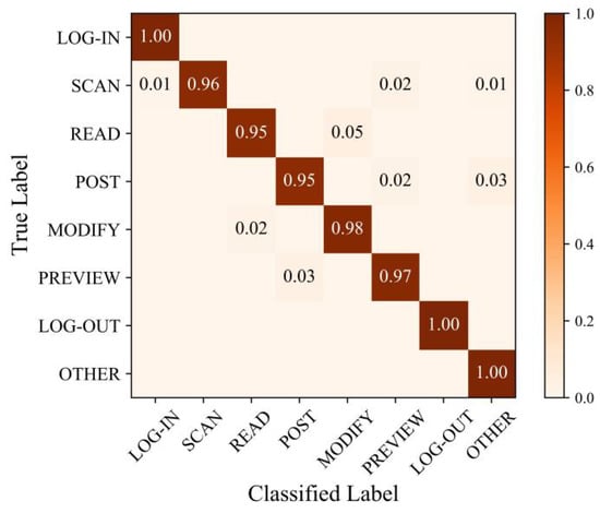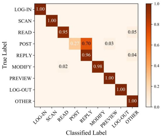 Figure 13 shows the confusion matrix of the identification results. In the confusion matrix, the horizontal axis represents the action types in the predicted label from the output of classifiers. In contrast, the vertical axis represents the one in a true label. Each cell along the main diagonal describes the correct rate of one single action identification, whereas the darker cell represents the higher correct identification rate. Accordingly, most single-action identification results are above 0.95. However, for action POST, the correct rate is very low (only 0.27). It is observed that 70% of the POST action is misidentified as the REPLY action.