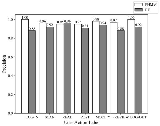 Motivated by the literature [42], we take the packet length and the following statistical information for each sequence: maximum, minimum, mean, median absolute deviation, standard deviation, variance, skewness, and kurtosis to build feature vectors. In order to reflect the distribution information of the traffic sequences, the numbers of packets that fall in five intervals, i.e., 0–300, 301–600, 601–900, 901–1200, and 1201–1500 are also considered as features. Figure 15 shows the comparison results between our PHMM model and the Random Forest classifier used in [43].