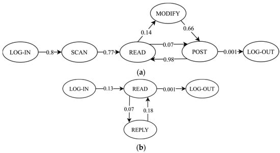 In this step, we investigate the feasibility of using clickstreams to model user roles. The study is based on detailed clickstreams (historical access log from 8 July 2018 to 7 May 2019) of a PHPWind-based (version 8.5, Hangzhou, China) social forum. Table 5 describes the dataset summary. In total, our dataset includes 1,810,873 clicks from registered users. After discarding events with missing fields or HTTP status associated with error codes (e.g., 301, 302), there are 1625 valid HTTP requests. We manually analyze the clickstreams and characterize each click with an IP address, a Unix epoch timestamp, and the corresponding user action. For example, the LOGIN action represents a user logging into his/her account, and the REPLY action indicates when a user leaves comments on blogs.