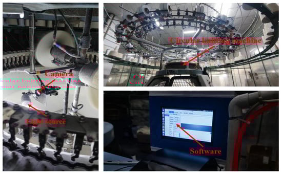 Figure 1. It primarily includes an image acquisition system and an image processing system. The image acquisition system consisted of a 2K area array camera and multiple light sources. This system can image the fabric produced by the circular knitting machine with high quality and capture defects such as broken warp, broken weft, warp shrinkage, weft shrinkage, torn holes, loose warp, and loose weft. The image processing system consisted of an industrial computer and detection system software to achieve accurate and real-time detection of various fabric defects.
