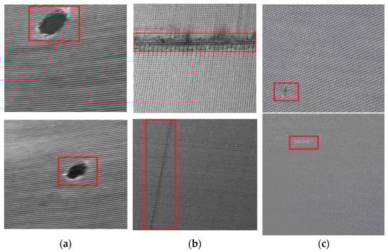 The self-built fabric defect dataset used in this paper was obtained from the production line. It was taken by the industrial area array camera, resulting in 400 × 400 resolution images after cutting processing. The total number of images was 2764. Skilled technicians then classified and labeled the images. Considering the difficulty of detecting different types of defects, the number of images was relatively small due to the regular shape of the holes. More images were collected for the L_Line and S_Line: 1644 and 877, respectively, as shown in
