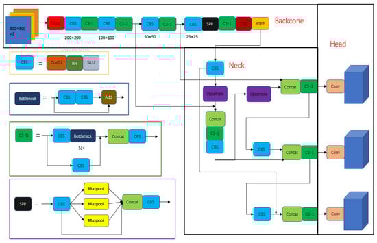 The backbone network consists of Focus, CBS, C3, SPP, and ASPP modules. The Focus module is used to convert high-resolution image information from spatial latitude to channel latitude. The CBS module consists of a convolution operation, batch normalization, and SILU activation function, which is the basic module of the backbone network. The C3 module consists of one bottleneck module, three outer CBS modules, and one concat module. In the figure, N in C3-N represents the number of stacked bottleneck modules. The design idea for the bottleneck module is inspired by the residual network to smooth the flow of positive and negative gradients. The combination design of three external CBS modules and concat modules is derived from from CSPNet [