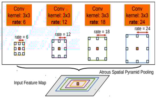 35] was first proposed in DeepLabv2. Although it was proposed to improve the performance of the semantic segmentation network, its method can also be used to improve the target detection network. ASPP uses convolution kernels with different expansion rates to pool the characteristic images and obtain the characteristic images of different receptive fields to extract the characteristic information at multiple scales without increasing the number of parameters or changing the resolution of the input image. As shown in Equation (1),