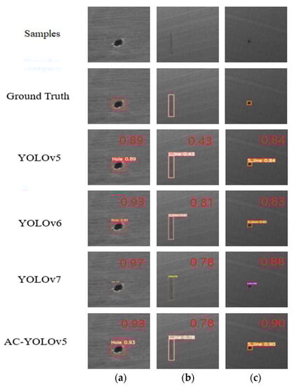 Figure 8. Compared to the YOLOv5 model, the AC-YOLOv5 model improved the detection accuracy for all three types of defects, and the AC-YOLOv5 model also showed better performance compared to the other current mainstream networks.
