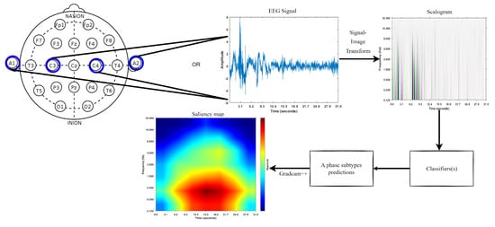 The proposed workflow consists of transforming EEG signal acquired from C4-A1 or C3-A2 to scalogram, feeding to classifiers for A/Not-A-phase classification, and visualizing the region identified by the deep learning network using Gradcam++.