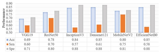 As mentioned earlier, six pre-trained deep learning classifiers were used; namely, VGG19, ResNet50, InceptionNetV3, DenseNet 121, MobileNet-V2, and EfficientNet-B0, to classify the A and Not-A-phases from the EEG signals. The performance of each classifier was tested using three metrics: accuracy, sensitivity, and specificity on the test dataset. Accuracy gives insight into correctly classified samples, where sensitivity and specificity define the classifier’s ability to correctly predict the presence (True Positives) and absence (True Negatives) of A-phases in the given EEG signal, respectively.