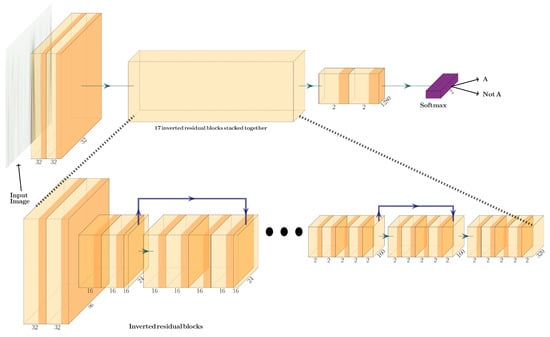 MobilenetV2 is a lightweight deep neural network exclusively designed for mobile embedded vision applications [31]. The architecture consists of a convolution layer with 32 kernels of size and 19 residual bottleneck layers. Each bottleneck layer consists of three convolution layers with ReLU6 activation, except for the third layer, with expansion factor and shortcut connections connecting them. The first and third layer performs pointwise convolutions , while the second layer performs depth-wise convolutions of kernel size . Finally, a fully connected layer of size 1280 with softmax function was included for classification. The bottleneck layers in the architecture make it memory efficient and less vulnerable to information loss due to non-linearities.