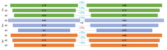 Since the dataset possesses a class imbalance, accuracy alone is not a good estimator for the performance analysis of the classifier. The reason is that a higher number of true negatives will contribute more to the accuracy than true positives. Hence, alternative performance metrics would be required to quantify the performance of classifiers for correctly classifying the samples from both classes (A and Not-A). Two such performance metrics are sensitivity and specificity. Sensitivity defines the percentage of correctly classified A-phases, whereas specificity depicts the percentage of correctly classified Not-A-phases. Figure 2 illustrates the accuracy, sensitivity, and specificity of various classifiers used in this study.