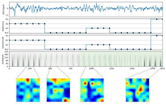 Gradcam++ was used to identify the regions from the scalogram images, which were used by the best-performing deep learning model. This includes visualizing the regions targeted by MobileNetV2 from the correct and incorrect classifications. Figure 5 presents the A/not-A predictions of a continuous EEG signal, depicting the CAP cycle. Analyzing the correctly classified samples gives insight into the regions identified by the MobileNetV2. In contrast, analysis of incorrectly classified samples would help exclude the regions causing the classifier to learn wrongly and understand the potential reasons behind it. For this purpose, the last feature extraction layer of the MobileNetV2 was selected, followed by feeding an input image to it, then Gradcam++ was used to produce a saliency map and its superposition with the original image, as shown in Figure 6.