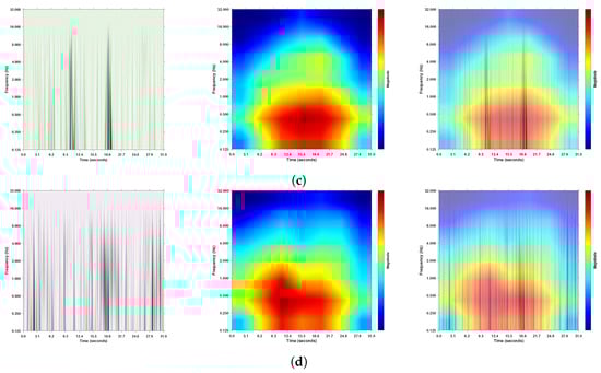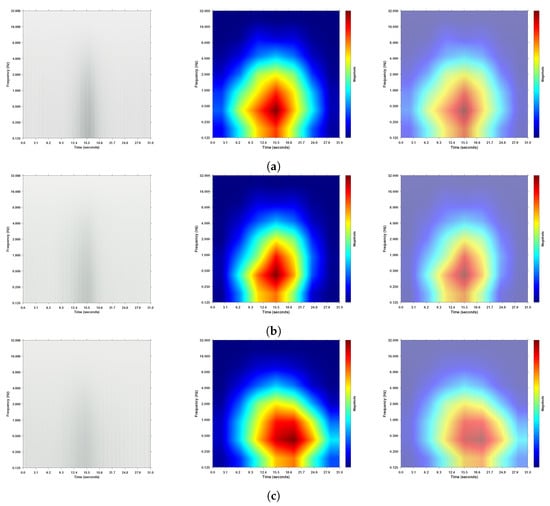The preprocessed signals, after sampling and filtering, were transformed into scalogram images. For each signal, a processing window of 31 s with an overlap of one second underwent continuous wavelet transform using the Ricker mother wavelet function. CWT was performed using the signal submodule of Python’s Scipy library. Consequently, 448,883 signal samples were transformed into the corresponding scalogram images.