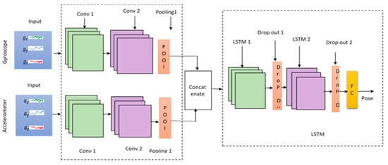 For deep learning-based pedestrian dead reckoning, there is a cooperation between CNN and LSTM to acquire the benefit of both modules. As shown in Figure 2, the six-axis IMU input sequence of window 200 frames is processed by 1D convolutional layers. It has 11 kernels,128 features with a fixed dimension, and a maximum pooling layer of size 3. The output from concatenated 1D CNN-model fed to the first bidirectional LSTM. Since the future and previous IMU readings have an influence on the relative pose regression, the two-layer LSTM model was used. Hence, the output from the first bidirectional LSTM was the input to the second bidirectional LSTM model. In order to prevent overfitting, the dropout layers with a 0.25 rate were used. Finally, the estimated output relative pose was generated by a fully connected layer.