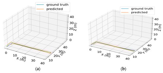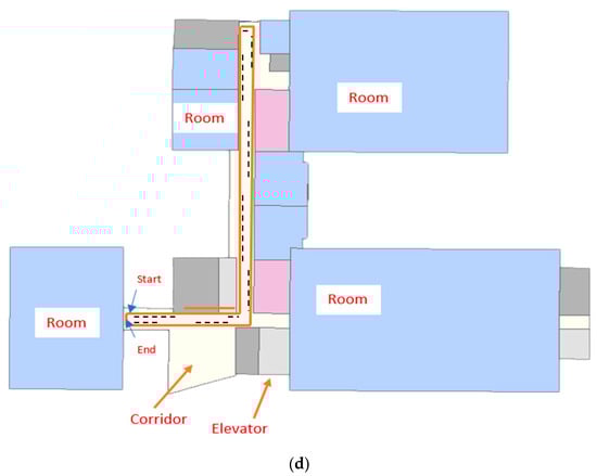 Table 1 shows the description of inertial odometry datasets collected with four different subjects—1 female and 3 males between the ages of 30 and 49. Each trajectory is about 2 min of normal walking along a corridor in a building as illustrated in Figure 2c,d. IMU data from the smartphone was used as input data for the model that tries to estimate the positions recorded by the backpack positioning system as shown in Figure 2a,b.