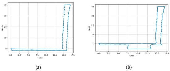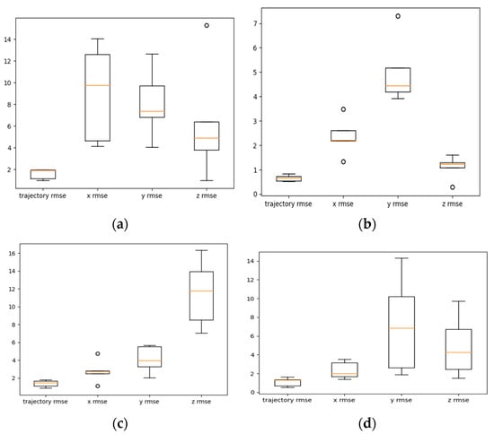 Figure 9 shows a comparison of each user’s trajectory of scenario 2. For our results, we displayed the root mean square error for each sequence from the four runs plotted in Figure 9a–d.