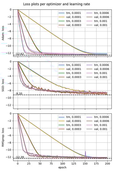 Increasing the learning rate also resulted in a noisier loss curve at low loss values. From Table 3, we can confirm that the Adam optimizer with a learning rate of 1 × 10−3 achieved a minimum validation loss of −12.62. Second was Adam with a learning rate 3 × 10−4 and a validation loss of −12.58, but with the advantage of having a smoother loss curve.