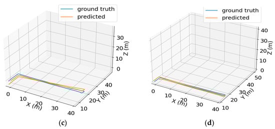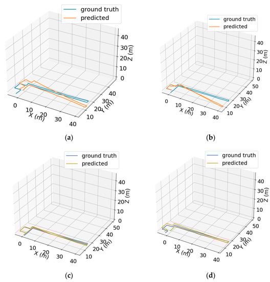 The training loss and validation loss vs. epochs in Figure 11 show how the epochs were distributed among the different users. The training loss and validation loss for large epochs were not smooth because of the variation in the learning rate. There was the probability of finding bad data for learning in large epochs and batch sizes. Even though the training loss and validation loss were very smooth in 100 epochs, the trajectory estimation was not fairly consistent within each user. The results of the various user’s specific validation and learning rate calculations were used to select the optimal number of epochs and sensitivity of parameters for the learning model. First, we picked out the suitable number of epochs for model training. Figure 11c,d shows the training and validation loss results for the model. In each case, the training and validation loss of the model reached its lowest level when epochs between 100 and 500 were used.