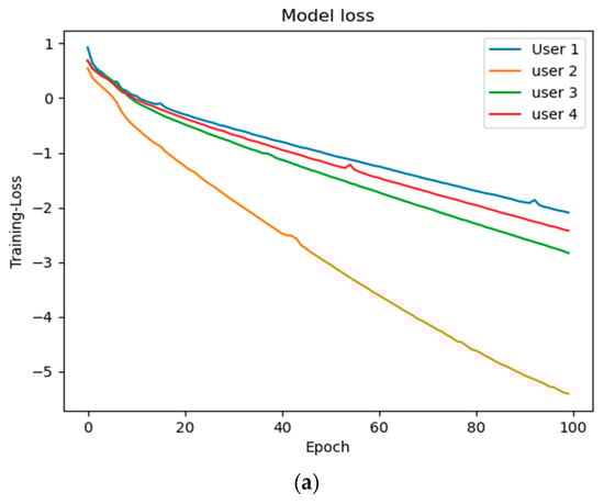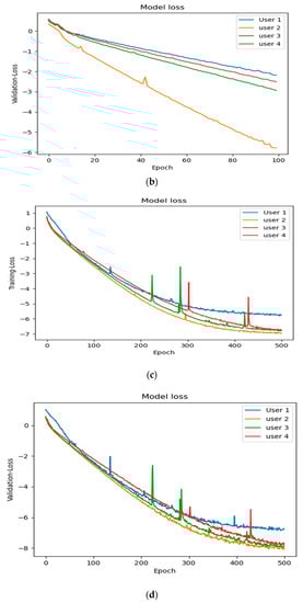 Each user’s training and validation loss on selected epochs for the model. (a) Training loss for 100 epochs; (b) validation loss for 100 epochs; (c) training loss for 500 epochs; (d) validation loss for 500 epochs.