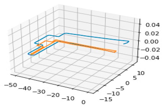 For each location, a floor-plan and recorded sequence of LIDAR pose was described in Figure 2c,d for scenario 1 and scenario 2, respectively. A sequence of five data points for scenario 1 and a sequence of five data points for scenario 2 were gathered to be processed. To see trajectories through a corridor of our building, we plotted the LIDAR pose which was considered as ground truth as shown in Figure 3a,b.