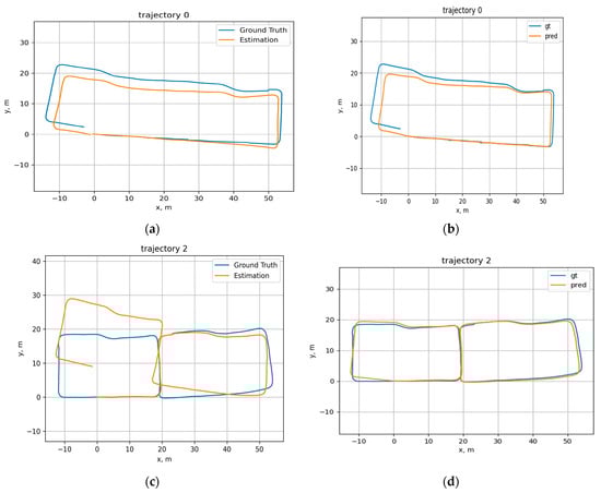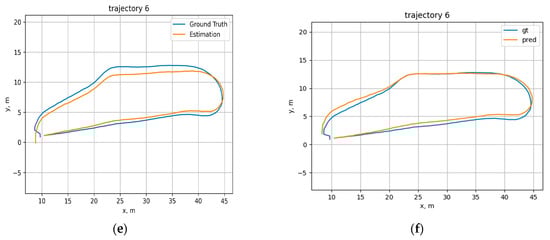 Ground truth and estimated trajectories on a dataset from the public repository provided by [17]. (a,c,e) shows estimated trajectory with normal training data. (b,d,f) shows the estimated trajectory with tuned better optimizer and learning rate. The result in the left column is from the publicly released model [17]. Our results are shown in the right column and are obtained from a model trained with an Adam optimizer with a learning rate of 3 × 10−4 (see Table 4).