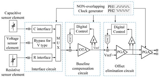 In summary, the existing analog front-end circuits are primarily tailored for specific sensors, neglecting the simultaneous consideration of detection range and precision [19,20,21,22]. The baseline compensation circuits are relatively limited and offer a narrow range of compensation [23]. Therefore, this paper proposes the design of a universal analog front-end circuit that achieves a wide compensation range for rail-to-rail voltage. It offers a wide measurement range and high precision, making it suitable for multiple types of sensors. The design is based on a switchable capacitor structure that is relatively universal and easy to implement. The main sections of this article are as follows: Section 2 introduces the proposed sensor analog front-end and its working principles. Section 3 includes the test results and discussions. Section 4 presents the conclusion.