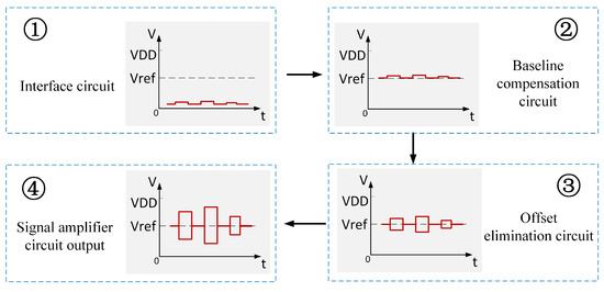 Figure 1 illustrates the overall system diagram of the proposed sensor interface analog front-end circuit in this article. The sensor signal acquisition circuit consists of capacitance, resistance, and voltage signal acquisition circuits. The corresponding acquisition method is selected based on the type of sensor, and an initial signal is controlled to be connected to the subsequent circuitry using switches. The acquired voltage signal is processed in the baseline compensation circuit, where a comparator, digital calibration circuit, and DAC are used to position the small signal around the mid-rail. The difference between the sensor signal and the mid-rail voltage represents the signal variation of the sensor. Since the digital calibration circuit introduces an error equal to the DAC resolution due to the level shift controlled by the DAC, an offset cancellation circuit is required to balance the input differential signal and further reduce the offset to a negligible level. Finally, the signal amplification circuit amplifies the processed analog signal for subsequent analog-to-digital conversion. The waveform of the entire signal processing process is shown in Figure 2.