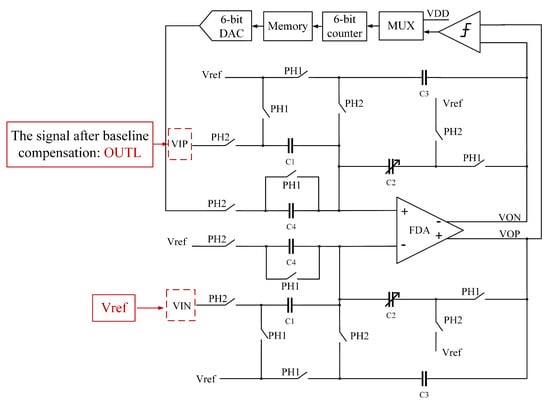 Secondly, due to the diverse sensor types, the baseline values of the acquired electrical signals differ significantly, which can lead to amplifier saturation and signal loss. Therefore, wide-range compensation of the baseline is necessary. Traditional sensor baseline compensation methods, such as the one proposed in [15], utilize variable resistance structures as reference resistors and determine the compensation value through negative feedback loops. However, the limited nonlinear range of operational amplifiers severely restricts the compensation range (5–110 k). In [16], a method based on the current compensation technique is proposed, which includes a current self-compensator and an improved current steering digital-to-analog converter (DAC). This approach offers lower power consumption, but the compensable range is limited to only 100 mV. The method proposed in [17] uses a capacitor array to compensate for baseline voltage. The maximum compensation range achievable with a 3 V power supply voltage is limited to ±350 mV, indicating a relatively small compensation range. These methods are customized for specific sensor types and are inefficient when applied to a universal analog front-end circuit. Another proposed method, in [18], incorporates a digital filtering structure into the amplifier section, which exhibits universality. However, it is greatly influenced by the common-mode range of the input stage bias, making it challenging to achieve considering process, voltage, and temperature variations.