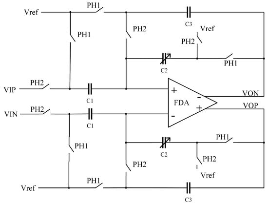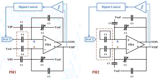 The structure of the offset cancellation circuit in two phases is depicted in Figure 8. The capacitor stores the DAC output voltage during the PH1 phase and discharges its charge during the PH2 phase. All capacitors are charged and discharged in two phases, satisfying the principle of charge conservation [30]. The input and output of the circuit can be decomposed into a differential mode signal and common mode signal, represented by the input voltages and , and the output voltages and , respectively. Let denote the ideal voltage at the input terminals of the operational amplifier at nodes A and B. First, let us analyze the charge on the capacitors in the PH1 phase, which can be expressed as