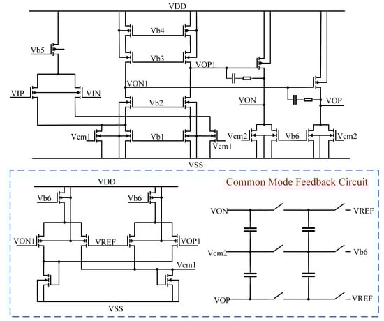 The amplifiers used in the offset cancellation circuit and signal amplification circuit are universal amplifiers for all C-V/R-V conversion sensor signals and direct voltage input interfaces. We use a fully differential amplifier (FDA) because it can suppress common mode noise such as 60 Hz power frequency interference and has a larger output swing range under the same gain conditions compared to single-ended output structures. The FDA is a two-stage amplifier, with the first stage utilizing a folded cascode amplifier configuration and the second stage being a common-source amplifier, as illustrated in Figure 10. In addition, related correlated double sampling (CDS) technology can be used in the FDA to greatly reduce the flicker noise and mismatch of the amplifier.