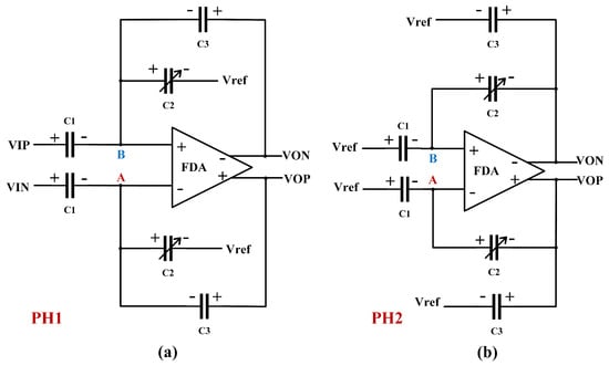 The circuit structure of the signal amplification circuit in two phases is shown in Figure 11, where (a) represents the input sampling phase PH1, (b) represents the amplification phase PH2, and represents the offset and noise effectively present at the input terminals. The circuit structure is similar to that described in Section 2.3, and the analysis of charge transfer has already been discussed.