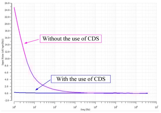 Transient simulations were conducted on the circuit before and after applying CDS technology, and the resulting noise power spectral density is depicted in Figure 12. It can be observed that the low-frequency noise is significantly suppressed. Through Monte Carlo simulations, it was determined that the offset of the operational amplifier has a 3 value of 7.8 mV. To simulate the offset, a DC signal of 7.8 mV was applied at one of the input terminals of the amplifier. After applying CDS and conducting transient simulations, the offset at the output terminal of the op-amp was found to be 0.18 mV. These simulation results validate the previous analysis.