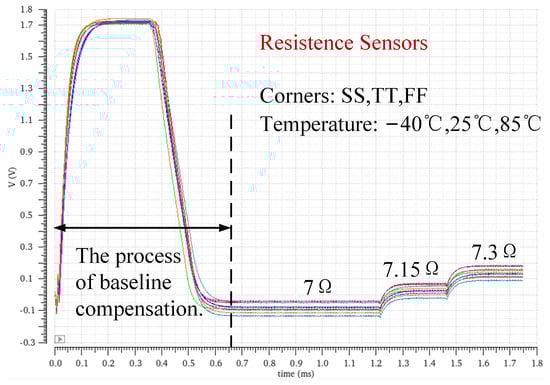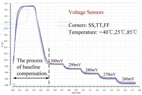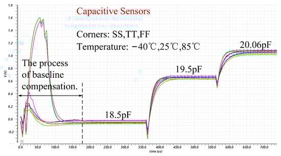 Transient simulations were performed on the circuit under SS, TT, and FF process corners at temperatures of −40 °C, 25 °C, and 85 °C, respectively. Standard capacitors, resistors, and voltage sources were used as the sensors. The overall functionality of the circuit under three different measurement modes is simulated and illustrated in Figure 13, Figure 14 and Figure 15. The waveforms on the graph represent the output differential signal of the final stage differential amplifier corresponding to capacitance values of 18.5 pF, 19.5 pF, and 20.06 pF, resistance values of 7 , 7.15 , and 7.3 , and voltage values of 300 mV, 290 mV, 280 mV, 270 mV, and 260 mV. It can be observed that the circuit exhibits favorable process and temperature characteristics.