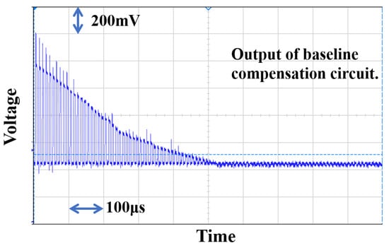 The signal collected from any type of sensor is transformed into a voltage signal distributed within a range from 0 to . This voltage signal may fall within the nonlinear region of the amplifier, which is undesirable. Compensating for the initial baseline of a resistance-type sensor can solve this issue. In Figure 18, the oscilloscope trace shows how the initial signal of about 650 mV is compensated to the reference level of 800 mV. Upon completion of voltage compensation, it can be observed that the difference between the compensated voltage level and the mid-rail voltage level is less than the resolution of the 8-bit DAC, thereby ensuring that the baseline signal remains within the operating range of the amplifier.
