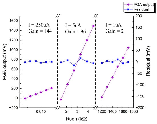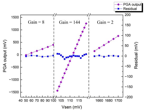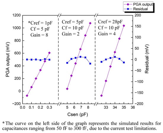 The performance of the sensor can be evaluated through linearity, and the analog front-end circuit used for the sensor should also possess adequate linearity. We use the coefficient of determination () to evaluate the linearity and calculate the root mean square error (RMSE). Figure 20 illustrates the C-V conversion characteristics of the analog front-end circuit, where selecting appropriate reference capacitance, feedback capacitance, and gain allows for the measurement of capacitive-type sensors within different ranges. Based on the results depicted in Figure 20, the calculated conversion gain for a gain of 2 is determined to be 0.32 mV/fF. The is 0.9988 and the RMSE is 1.201%. Figure 21 displays the R-V conversion characteristics of the analog front-end circuit, where choosing suitable injection current and gain enables the measurement of resistive-type sensors within different ranges. Based on the results depicted in Figure 21, the calculated conversion gain for a gain of 96 is determined to be 9.7 mV/. The is 0.9996 and the RMSE is 0.950%. Figure 22 showcases the V-V conversion characteristics of the analog front-end circuit, where selecting the appropriate gain allows for the measurement of voltage-type sensors within different ranges. Based on the results depicted in Figure 22, the is 0.9999 and the RMSE is 0.678%.