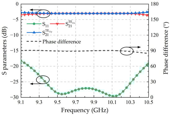 Simulated results of the magnitude and phase difference of S parameters are shown in Figure 5. It can be seen that the reflection of the converter is less than −25 dB within the frequency range of 9.4–10.2 GHz. In addition, the amplitudes of the two orthogonal TE11 modes at the output port are almost equal, and the phase difference is about 90°, which satisfies the condition for forming an LHCP wave.