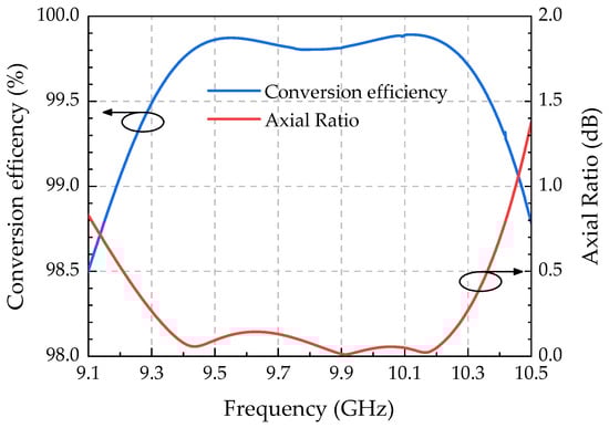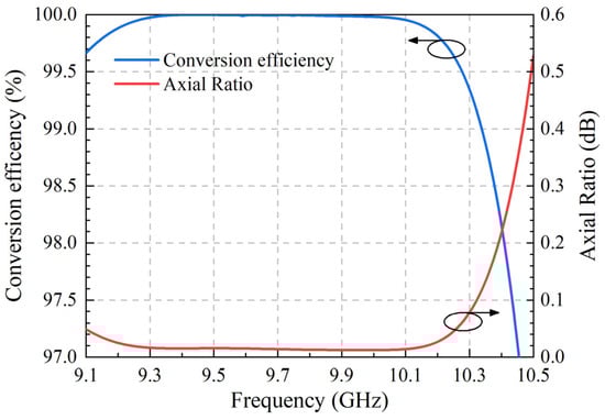 When an LHCP wave is injected into the LH-RHCP mode converter, the magnitude and phase difference of S parameters are simulated and displayed in Figure 8. It is observed that the reflection of the LH-RHCP mode converter is less than −25 dB within the frequency range of 9.1–10.2 GHz. Moreover, the amplitudes of the two orthogonal TE11 modes at the output port are nearly identical, and the phase difference is approximately −90°. Consequently, the LH-RHCP mode converter can effectively convert the input LHCP wave into an output RHCP wave. The axial ratio and conversion efficiency of the converter are calculated and presented in Figure 9. It is obvious that the conversion efficiency is greater than 99.7% and the axial ratio is less than 0.1 dB within the frequency range of 9.2–10.2 GHz.