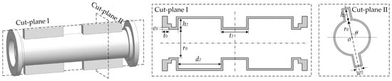 The LP-LHCP mode converter is composed of a rectangular waveguide, a rectangular-to-circular transition waveguide, and a rectangular groove circular polarizer, as depicted in Figure 4. To facilitate the connection with other waveguide components in the HPM systems, the rectangular waveguide employs a standard WR90 waveguide. The rectangular-to-circular transition waveguide serves to transform the input rectangular waveguide’s TE10 mode into the LP TE11 mode in the circular waveguide. The rectangular grooves of the circular polarizer are oriented at 45° with respect to the electric field of the input LP TE11 mode, which enables the conversion of the circular waveguide’s LP TE11 mode to the CP TE11 mode. A metal cylinder with a length of t0 and a thickness of e0 is attached to the outer side of the circular waveguide flange on the right side of the LP-LHCP mode converter. The dimensions of the cylinder are identical to those of the slots on the circular waveguide flanges on both sides of the LH-RHCP mode converter. When the LP-LHCP mode converter is connected to the LH-RHCP mode converter, the metal cylinder can be precisely aligned with the grooves to provide robust mechanical support.