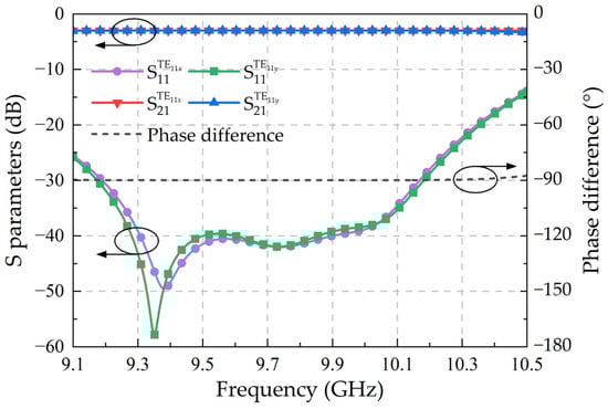 To illustrate the characteristics of the circular polarizer, for the TE11x mode and TE11y mode wave incident, respectively, at the input port with a normalized amplitude and an equal phase of 0°, corresponding to input vectors a1 = [1,0,0,0]T and a2 = [0,1,0,0]T, the output vectors are b1 = S′·a1 = and b2=S′·a2 = , respectively. Namely, when the input port electric field is the TE11x mode, the circular polarizer can output an LHCP wave. Conversely, when the input port electric field is the TE11y mode, the circular polarizer can output an RHCP wave.