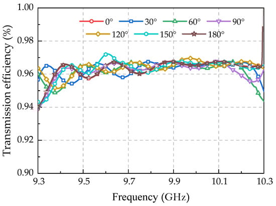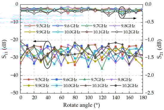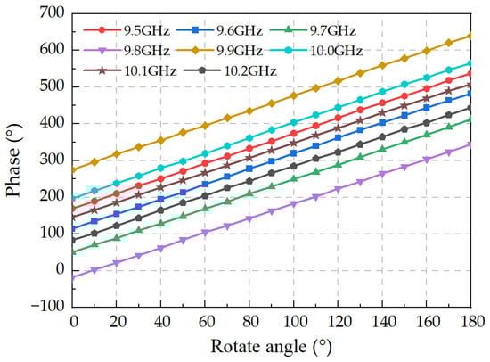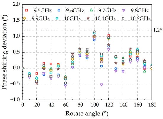 Figure 14 illustrates the phase-shifting deviation of the phase shifter at different rotation angles. It can be seen that in the frequency range of 9.5–10.2 GHz, the maximum phase-shifting deviation is less than 1.2° during the rotation process from 0° to 180°.