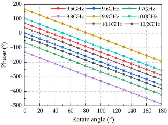 To validate the aforementioned phase-shifting principle and design method, a prototype of a phase shifter with a center frequency of 9.8 GHz was manufactured, and its transmission characteristics were tested using an Agilent vector network analyzer (VNA), as shown in Figure 16. Figure 17 presents the measured results of the transmission characteristics of the phase shifter at varying rotation angles. The measured data demonstrate remarkable agreement with the simulation results. Within the frequency range of 9.5–10.2 GHz, the reflectance remains below −20 dB throughout the entire rotation process, while the insertion loss is almost always below 0.3 dB. This indicates that the phase shifter exhibits good stability and transmission efficiency. Finally, Figure 18 illustrates the measured phase characteristics at varying rotation angles. Figure 18 and Figure 13 show the trend of phase variation with rotation angle, but it is worth noting that they show opposite trends. This is due to the different rotation directions of the phase shifter. The measured phase characteristics indicate that the phase shifter is capable of achieving a linear phase adjustment of 360° when rotated by 180° within the frequency range of 9.5–10.2 GHz.