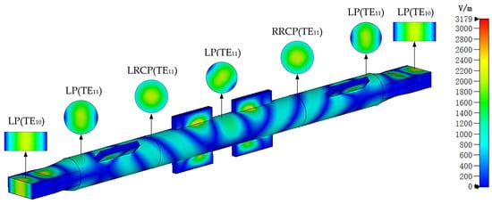 Since the LHCP and RHCP mode converters are mirror-symmetric on the center plane of the phase shifter, the transmission characteristics of the RHCP mode converter are basically the same as those of the LHCP mode converter. It should be noted that the rectangular grooves of the circular polarizer are oriented at −45° with the electric field of the output LP TE11 mode, as shown in Figure 10. The RHCP mode converter can convert the RHCP wave generated by the LH-RHCP mode converter into a rectangular waveguide TE10 mode output.