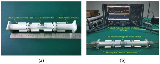 A high-power rotary waveguide phase shifter based on circular polarizers is presented. As illustrated in Figure 1, the structure of the phase shifter comprises a linearly polarized to left-handed circularly polarized (LP-LHCP) mode converter, a left-handed to right-handed circularly polarized (LH-RHCP) mode converter, and a linearly polarized to right-handed circularly polarized (LP-RHCP) mode converter. The entire phase shifter exhibits mirror symmetry. By rotating the LH-RHCP mode converter, a 360° linear phase shift can be achieved, with the phase shift being twice the rotation angle. Through the simulation analysis and experimental testing of the X-band rotary waveguide phase shifter, it has been demonstrated that the proposed phase shifter possesses advantages such as a high phase-shifting accuracy, low insertion loss, and wide operating bandwidth.