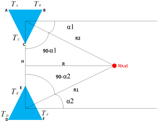 Figure 2 shows two thermal sensor cells separated by a distance H. The first cell includes the three sensors A, B, and C, which form the angle with the line connecting the heat source to the cell, and the second cell includes the sensors E, F, and D, which form the angle . Using the second cell, we can calculate the temperature value of the source by calculating the distance between the source and the sensor cell. The heat source and the cells form a triangle in which the length of one side and the values of the angles between the heat source and the cells are known. This means that we can calculate the distances between the heat source and the sensors. Now we can calculate the temperature gradient along a known distance as given by [37] and shown in Equation (6). For more details about GDS, please refer to [34,35,37].